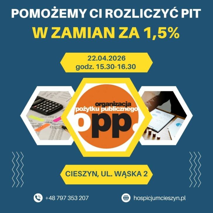 Czy wiesz, że możesz przekazać 1,5% swojego podatku na rzecz cieszyńskiego Hospicjum, nie płacąc ani złotówki więcej? Wystarczy, że skorzystasz z naszej bezpłatnej pomocy przy rozliczeniu PIT!